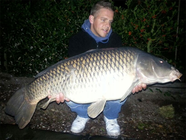 Op naar water 2. Eerst even een avondje wezen stappen, zodat ik deze stek op vrijdag avond kon gaan aanvoeren met de de Redflower- gemengd met de Cannibal Krill Squid- boilie. Het moest weer gaan gebeuren! Ik kan hier maar 2 hengels kwijt i.v.m. vele eilanden gezonken takken enz. Na de hengels te hebben beaast met de Snowgirl was het al snel raak. De eerste vis lag op de mat en wel gelijk een schub van 34 pond!!!
